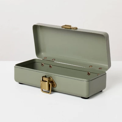 Storage meets elegance in this Small Rectangle Metal Box with Brass Hardware from Hearth & Hand™ with Magnolia. Made of metal, this rectangular box is ideal for storing a variety of frequently used items. This lidded box is designed in a green hue for a serene vibe and features a single latch closure in a brass finish for a simple yet timeless look.