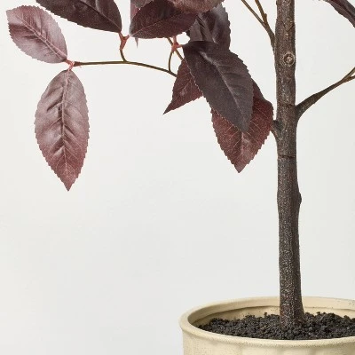 Liven up your home decor with this 34″ Black Plum Leaf Potted Artificial Fall Mini Tree from Hearth & Hand™ with Magnolia. This artificial plant features a single stem with multiple branches, each covered with realistic plum leaves for a natural appearance. This plant sits in a round container with ribbed designs crafted from ceramic for a modern touch. Suitable for indoor use, this faux plum plant works as a stunning centerpiece for your home decor.
