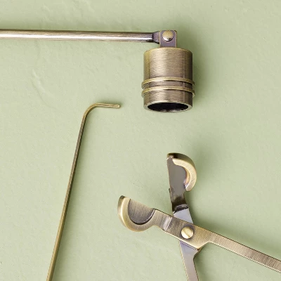 Maximize the life of your treasured candles with the help of this 4-Piece Candle Tool Accessories in Brass Finish Box from Hearth & Hand™ with Magnolia. Made of metal, this candle accessory set is designed in a brass finish for timeless elegance. This set includes a candle snuffer, wick trimmer, wax dipper, and a stylish storage box—everything you need for refined candle care. Plus, the storage box is adorned with a variety of diamond patterns, adding a vintage charm.