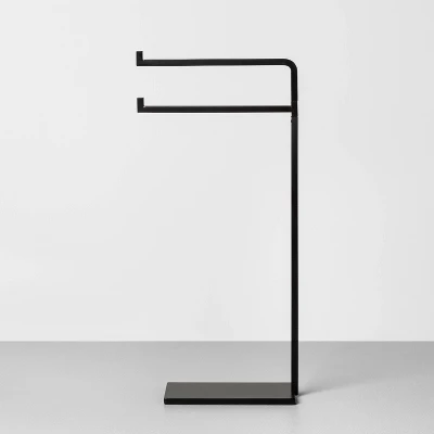 Bring organization to your bathroom with the Bath Towel Stand in Black from Hearth & Hand™ with Magnolia. Set on a rectangular bar-like base, this metal bath towel stand features two arms — one fixed and one movable — to allow you to hang different washcloths, bath towels or hand towels. Compact in size, making it just the right pick for smaller bathrooms, you can easily place it over the sink or near the bath stall area to add style and efficient space organization to your bath space.
