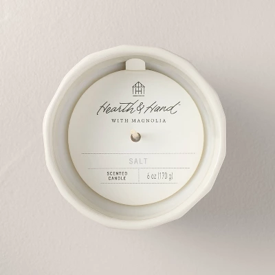 Feel refreshed with the oceanside aroma of this Speckle-Faceted Ceramic Salt Jar Candle from Hearth & Hand™ with Magnolia. This white jar candle features a round shape with a speckled, faceted design for an appealing look. The scented jar candle has a mix of sea salt and fresh scents to help create a delightful ambience. Made of ceramic and filled with palm and paraffin wax, this faceted jar candle burns for around 20 hours.