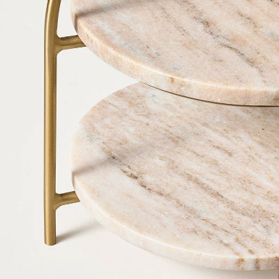 Create a gorgeous table setting for any occasion with the Tiered Marble and Brass Serving Stand from Hearth & Hand™ with Magnolia. This warm beige serving stand has two tiers to give you ample space for desserts, baked dishes and other items. Designed with a brass frame, this round serving stand comes with a marble base for a beautiful look.